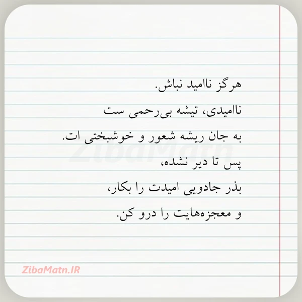 هرگز امیدت را از دست نده. ناامیدی مانند تبری است که ریشه های آگاهی و خوشبختی ات را نابود میکند. پس تا فرصت هست، بذر امید را در وجودت بکار و منتظر باش تا معجزات و اتفاقات خوب در زندگیت رخ دهند.