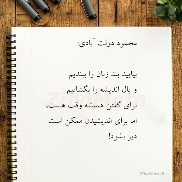 محمود دولت‌آبادی می‌گوید بهتر است کمتر حرف بزنیم و بیشتر فکر کنیم. فرصت برای صحبت کردن همیشه هست، اما اگر دیر به فکر فرو برویم، ممکن است فرصت اندیشیدن را از دست بدهیم. پس ذهن خود را رها کنیم تا اندیشه پرواز کند.