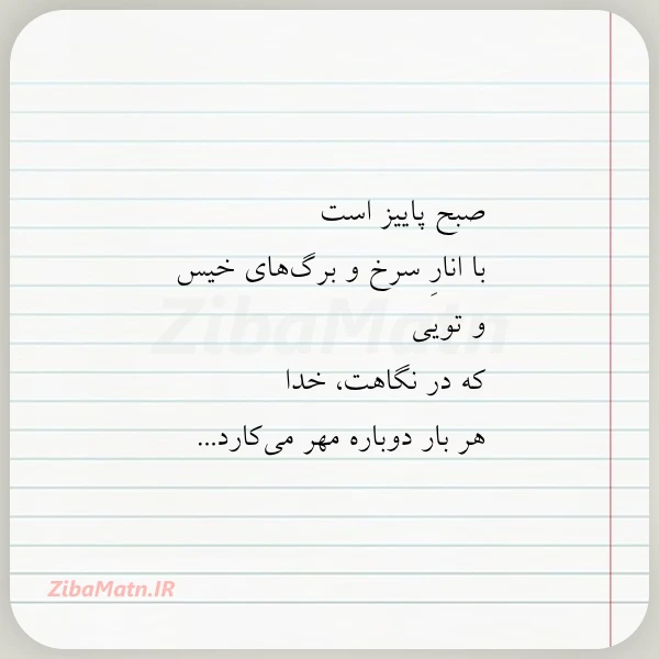 صبح پاییزی با انارهای قرمز و برگهای نمناک از راه رسیده است. در این فضا، حضور معشوق، با نگاهی که هر بار خدا در آن مهر و محبت میآفریند، گرمابخش و امیدبخش است. گویی نگاه او، تکرار عشقی الهی در دل پاییز است.
