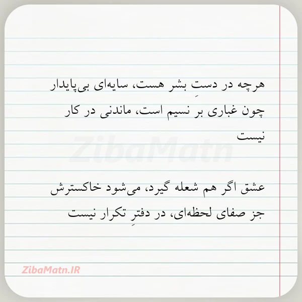 هرچه در دستِ بشر هست، سایهای بیپایدار چون غباری بر نسیم است، ماندنی در کار نیست عشق اگر هم شعله گیرد، میشود خاکسترش جز صفای لحظهای، در دفترِ تکرار نیست